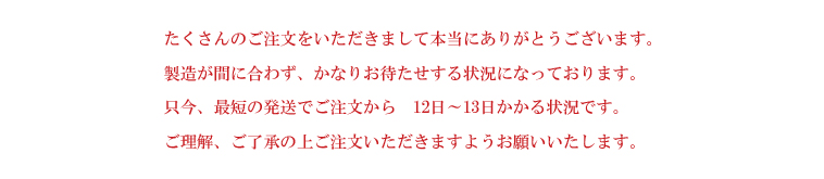 | ★年末年始・夏期休暇・地方祭などの長期休暇に当たる日にご注文いただいた場合、休み明けの営業日にご注文確認メールを送らせていただきます。 |